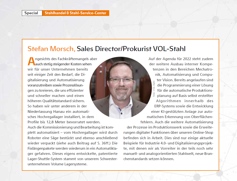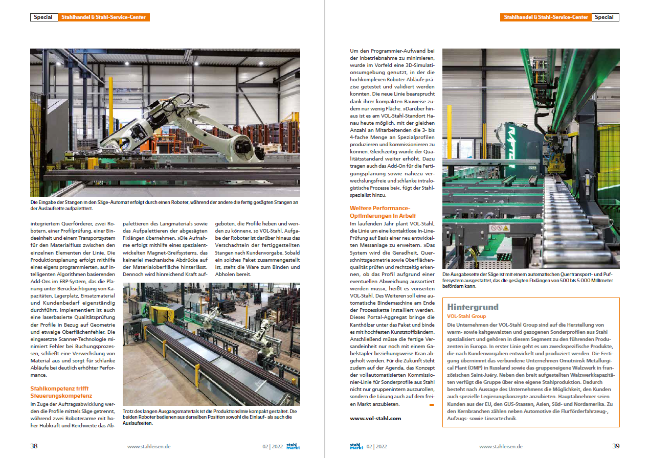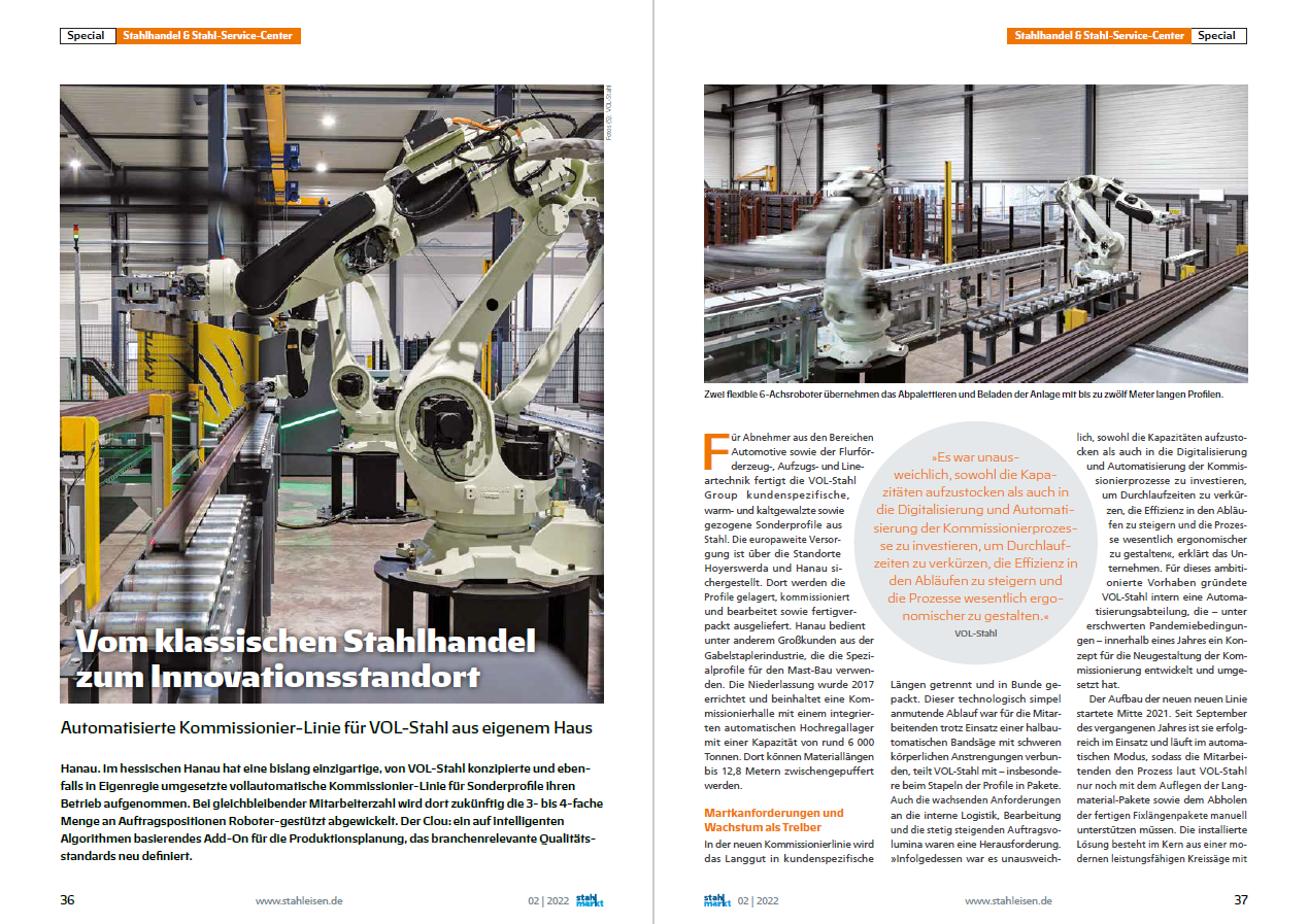 In der aktuellen Ausgabe des stahlmarkt, Ausgabe 02-2022, finden Sie einen interessanten Fachbeitrag zu unserer neuen automatisierten Kommissionier-Linie in Hanau (von Seite 36-39) und ein Statement von unserem Niederlassungsleiter Stefan Morsch zum aktuellen Stand und Umsetzungsgrad von Industrie 4.0 in unserem Unternehmen (auf Seite 34).