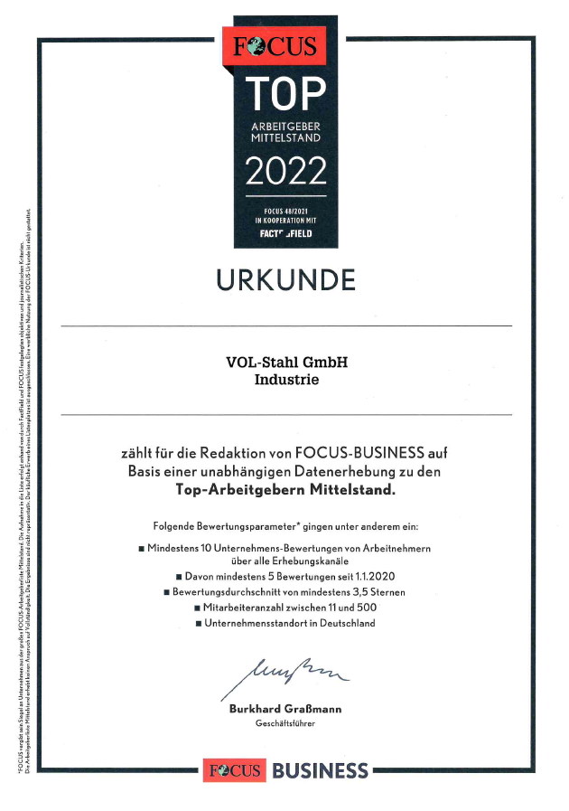 VOL-Stahl gehört zu den Top-Arbeitgebern im Industrie-Mittelstand