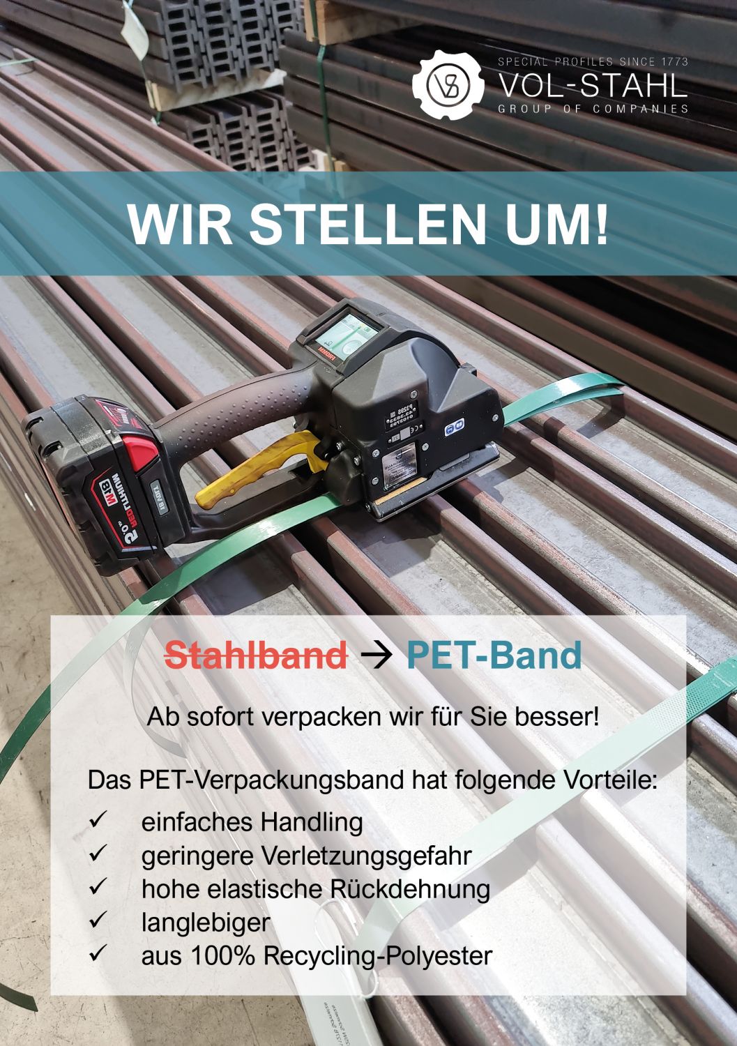 Wir ersetzen das Stahlband durch PET-Band.